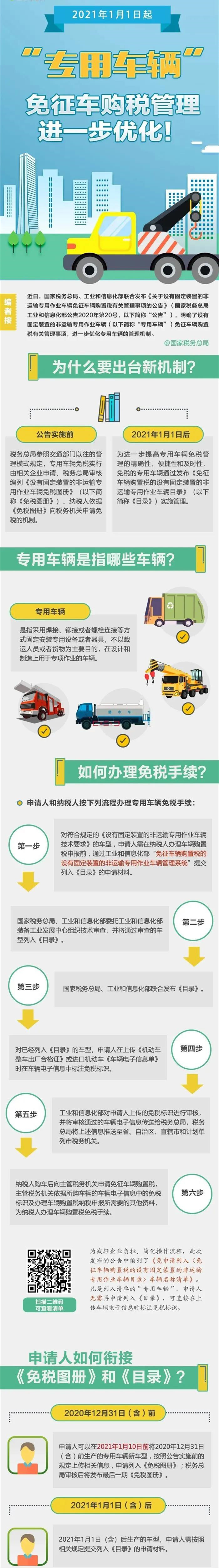 • 2021年1月1日起,我國將對免征車輛購置稅的設有固定裝置的非運輸專用作業車輛(以下簡稱“專用車輛”),由原來的“《免稅圖冊》管理”改為“《目錄》管理”。為確保該項機制順利實施,稅務總局、工信部日前聯合發布《關于設有固定裝置的非運輸專用作業車輛免征車輛購置稅有關管理事項的公告》(國家稅務總局 工業和信息化部公告2020年第20號),明確若干管理事項。消防車屬于專用車的一種,也屬于免征車輛,以下要點需要納稅人關注↓