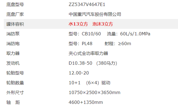 重汽豪沃16噸泡沫消防車參數(shù)配置